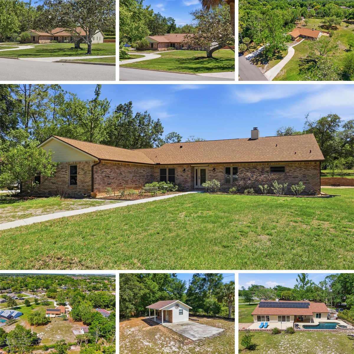 The property offers a 4-bedroom, 2.5-bath split floor plan, an oversized two-car garage, and an additional detached garage/workshop. The spacious kitchen features modern wood cabinetry and granite countertops.